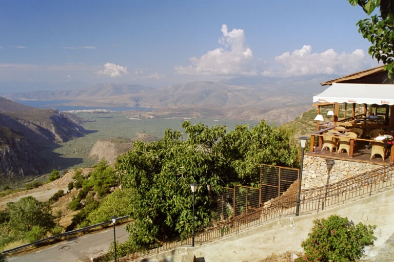 Blick von Delphi über den grössten Olivenhain Europas nach Itea