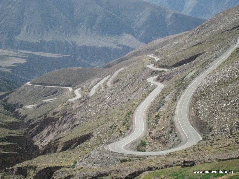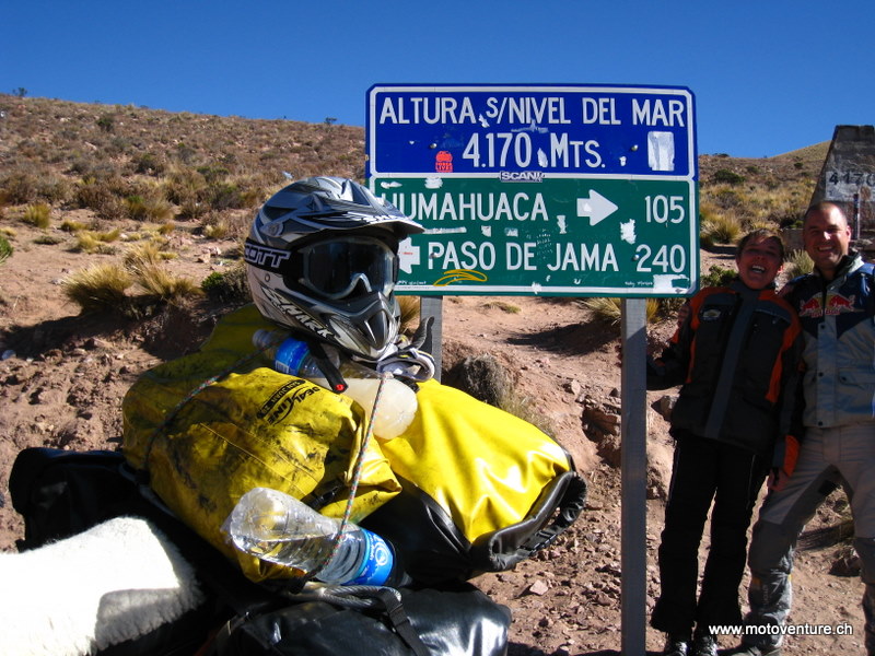 Von 2500müM gehts weiter in Richtung Jama Pass. Auf Abschnitte mit Serpentinen folgen weite Täler und gar ein grosser Salzsee. Im Gegensatz zum brasilianischen BMW-Fahrer, den wir am Mittag am Salar Grande treffen, der 700km (Salta - San Pedro de Atacama) an einem Tag abspult, nehmen wir es gemütlich und klimatisieren uns auf 3600müM an, bevor es am folgenden Tag auf 4800m nach Chile rüber geht. Nicht nur die Katis atmen schwer. Auch wir holen tief Luft, um an etwas Sauerstoff zu gelangen.