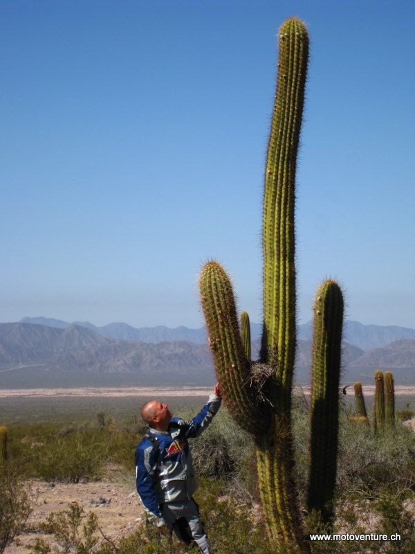 Unten im Tal angekommen besuchen wir die Ruinen der Quilmes (ein Indio-Volk das sich 170 Jahre lang erfolgreich gegen die Spanier durchsetzte, um dann in der Deportation in BsAs zu enden) Bei der Begehung der weitläufigen Anlage läuft uns dann auch der Schweiss über die Stirn, den Rücken, den Beinen entlang in die Stiefel. So schnell wie sich die Temperaturen hier ändern können wir unsere Klamotten gar nicht wechseln.