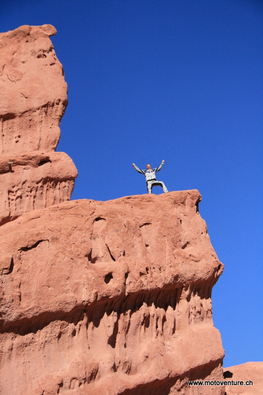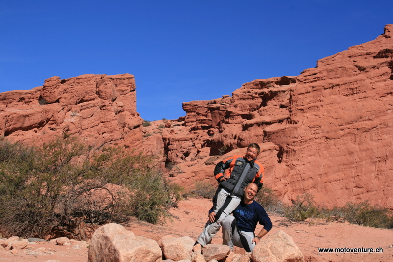 Die anschliessende Fahrt nach Salta entschädigt für alles. Ein buntes Tal mit satten roten Felsen, grünen Bäumen und ein strahlend blauer Himmel. Unsere Kameras laufen heiss und für 50km Strecke brauchen wir den halben Tag. Solange bis die Hungerrast uns überwältigt und wir am Strassenrand auf unsere Reserven zurückgreiffen müssen.