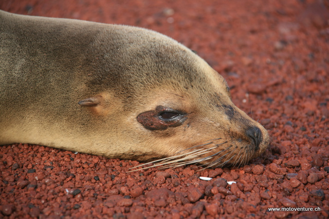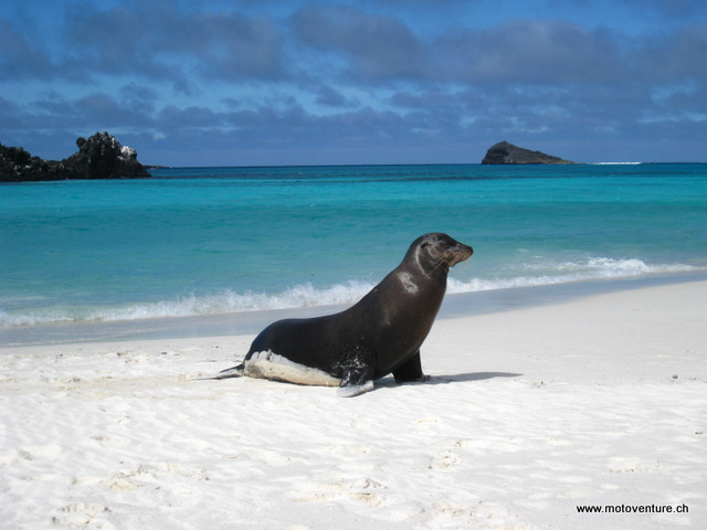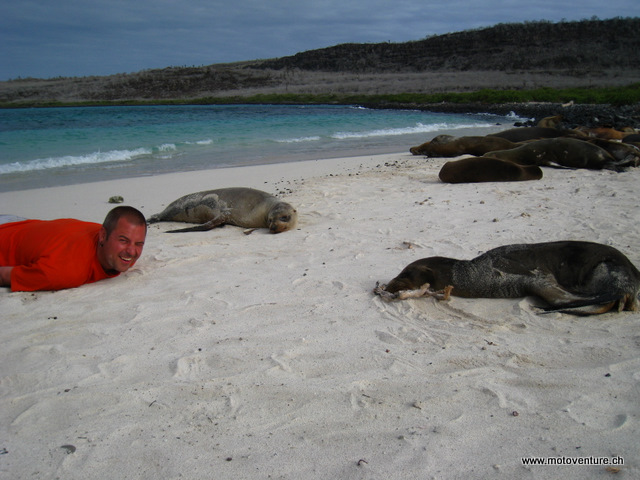 An den Straenden und im Wasser tuemmeln sich etliche Seeloewen. Sie sind so zutraulich und an Touristen gewoehnt, dass wir sogar mit ihnen zusammen schwimmen koennen. Beim Schnorcheln greifen sie nach den Flossen und schnappen nach den Luftblaeschen. Superschoen…