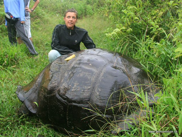 Die Riesenlandschildkroeten sind beeindruckend gross und leben in freier Wildbahn. Die Touren auf Galapagos sind nur mit Guide gestattet und so stampfen wir gemeinsam durch den Schlamm und bekommen den “Riesenkoloss” vor die Fuesse.