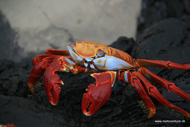 Diese farbenpraechtigen Krebse krabbeln zu Massen aus dem Meer. Hier auf Galapagos stehen auch diese unter dem Tierschutz. In anderen Teilen des Landes findet man sie in der Suppe vor. “Parihuela”