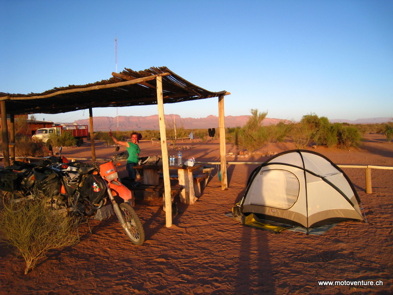 Als Entschädigung können wir beim Parkeingang unser Zelt aufschlagen und gemütlich am Tisch
