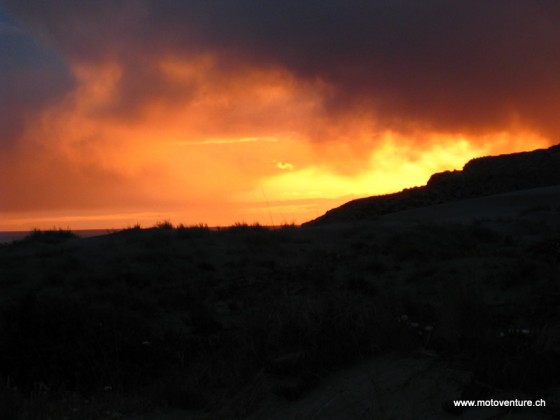 Am Morgen: auf dem Weg zur grössten Magellan-Pinguin-Kolonie ausserhalb der Antarktis scheint noch die Sonne. Auf dem Rückweg am Abend peitscht uns der ersten Hagel auf dieser Reise ins Gesicht. Das ist eben Patagonien.