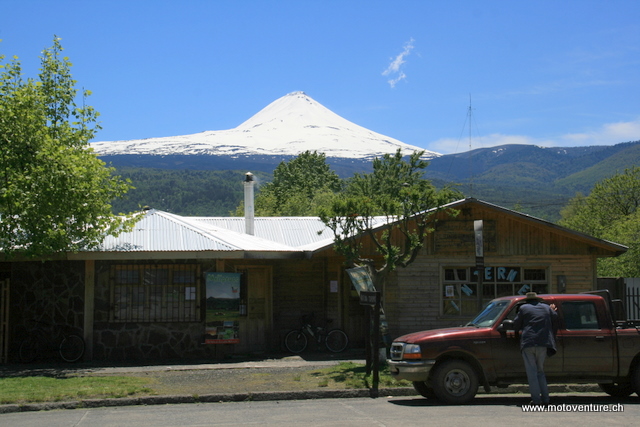 Im Hintergrund liegt der am 1. Januar 2008 letztmals aktive Vulkan Llaima (Chile). Die Strasse hat immer noch Wintersperre, sodass wir gezwungen werden nach Süden abzudrehen. Das ist der Beginn unserer eigenen Episode von “long way down”.