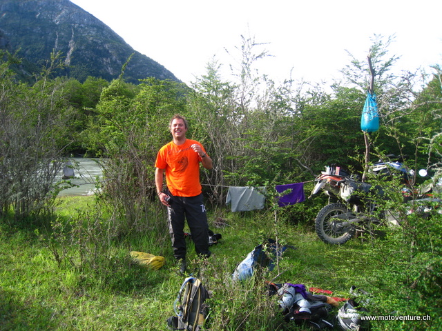 Nach einigen weiteren Kilometern lädt uns ein verlockendes Plätzchen dazu ein, unsere Stoffbehausung aufzubauen. Idyllische Freecamps gibt es in Südchile in Hülle und Fülle. Die Buschdusche muss man allerdings selbst installieren.