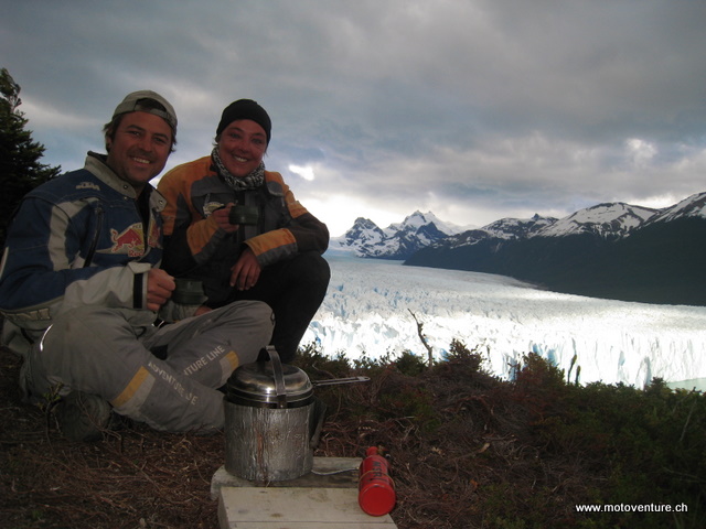 Die Strasse endet für uns nach 1000km in Villa o`Higgins, von wo wir mit dem Schiff den gleichnamigen Gletscher bei perfektem Fotowetter erkunden. Das Eis fliesst vom Campo Hielo del Sur, dem grössten Eisfeld nach der Antarktis in den Gletschersee ab. Die Crew bringt einen abgebrochenen Eisklotz an Board und serviert uns einen Wiskey on the rocks mit glasklarem, hundertjährigem Eis.