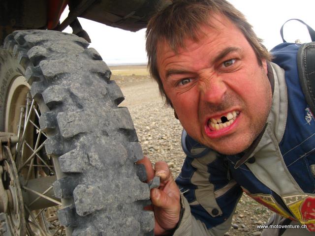 Dennoch sind die Distanzen, die harte Fahrweise und der kräftige Gegenwind nichts für die Langlebigkeit der Reifen. Wir beissen uns die Zähne an der patagonischen Pampa aus!