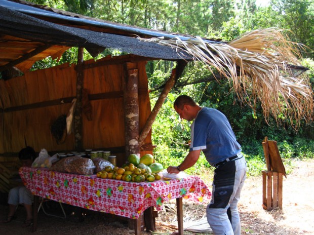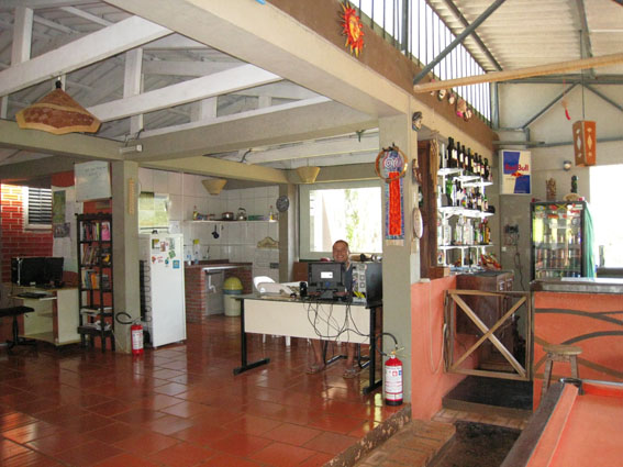 Am Mittag kehren wir in einer Churrasceria (Grill-Restaurant) am Strassenrand ein. Man fragt uns auf portugiesisch, ob wir Mittag essen wollen. Unsere Antwort: “si si, claro” er verschwindet in der Kueche. Kurz darauf haben wir zehn Platten mit Reis, Kartoffeln, Poulet, Goulasch, Rippchen, Steak, und verschiedene Salate auf dem Tisch. Eine Menge, die in der Schweiz fuer 4 Personen aufgetischt wird. Alles schmeckt super und uns platzt fast der Wanz als wir das Lokal um 15 Franken erleichtert verlassen…